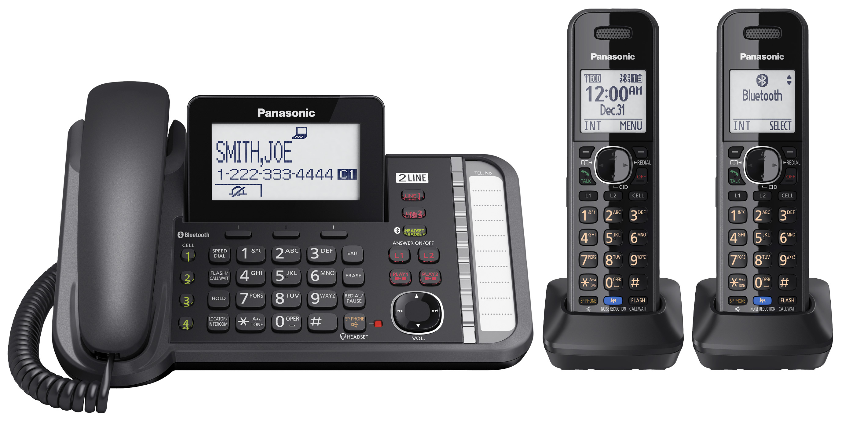 - 2-Line CordedCordless Expandable Link2Cell System with 2 Cordless Handsets- Sync up to 4 smartphones via Bluetooth to make and receive calls using Link2Cell handsets - Connect to your PC to make and receive calls from Outlook - 3-way conferencing with hands-free speakers in base unit and handsets - Superior sound control with tone equalizer and noise reduction - White backlit LCD display and dialpad on base - Frequency: 1.9GHz (DECT) - Corded or Cordless: Both - Speakerphone with 6-step volume - Number of Phone Lines: 2 - Bluetooth: Yes - Link2Cell: Yes, up to 4 mobile devices - Handsets Included: 3 - Maximum Number of Handsets: 12 - Dual line answering system with combined recording time of up to 60 minutes - Message Waiting Indicator: Auditory and visual - Cordless Handset LCD Display: 1.8IN 103x65 pixel FullDot monochrome - Display Languages: English, Spanish - Amber backlit keypad - Talking Caller ID - Phonebook Entries: up to 3000 - 1 USB port for charging external devices -Accessory Handset: TGA950 - Headset Jack: 2.5mm, Bluetooth-compatible - Battery Type: 2 rechargeable nickel metal-hydride AAA batteries (HHR-4DPA) - Cordless Handset TalkStandby Time (hours): 15168 - Cordless Handset Charge Time (hours): 7 - Hold - Mute - Battery backup in the base works up to 75 minutes during power outage - Call waiting - Wall-mountable - Package Includes: 1 corded base handset, 2 cordless handsets, 1 AC adapter, 1 4-wire telephone line cord, 1 2-wire telephone line cord, 1 desk standwall-mounting adapter, 1 corded handset cord, 6 rechargeable batteries, 2 handset covers, 2 belt clips, 2 charging bases, 1 mini USB cable, 1 CD