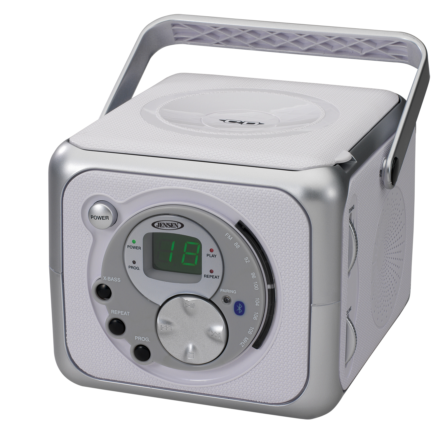 - Supports A2DP, AVRCP- Top Loading CD Player- CD-RRW Compatible- Green LED CD Track Display- SkipSearch, Forward and Back- Repeat 1 or All- Programmable Memory- FM Stereo Receiver- Bass Boost- Headphone Jack- Auxiliary Input Jack for Connecting Your iPod, MP3 or other Digital Audio Players- Built-in Carrying Handle- Power: 120V AC Adaptor (Included) or 6 x āCā (UM-2) Batteries (Not included)