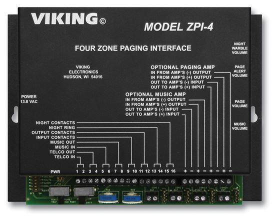 - Touch Tone control of four zones (expandable to 8 zones)- Switches line level signal to amplifiers or amplified signal to speakers (amplifier(s) not included)- Balanced audio circuitry for low noise- Night bell warble with adjustable level from contact closure or ringing analog line- Input provided for background music- Separate paging and background music level adjustments- Background music automatically mutes in paged zone(s) in all but single amplifier mode- All-call and five group call patterns, selected by Touch Tones- Adjustable page alert tone level- Interfaces with ringing C.O. lines, Centrex lines, paging ports, unused phone system trunk inputs, or ringing analog station ports- Disconnects on timeout, silence, or CPC- Screw terminals for all input and output connnections